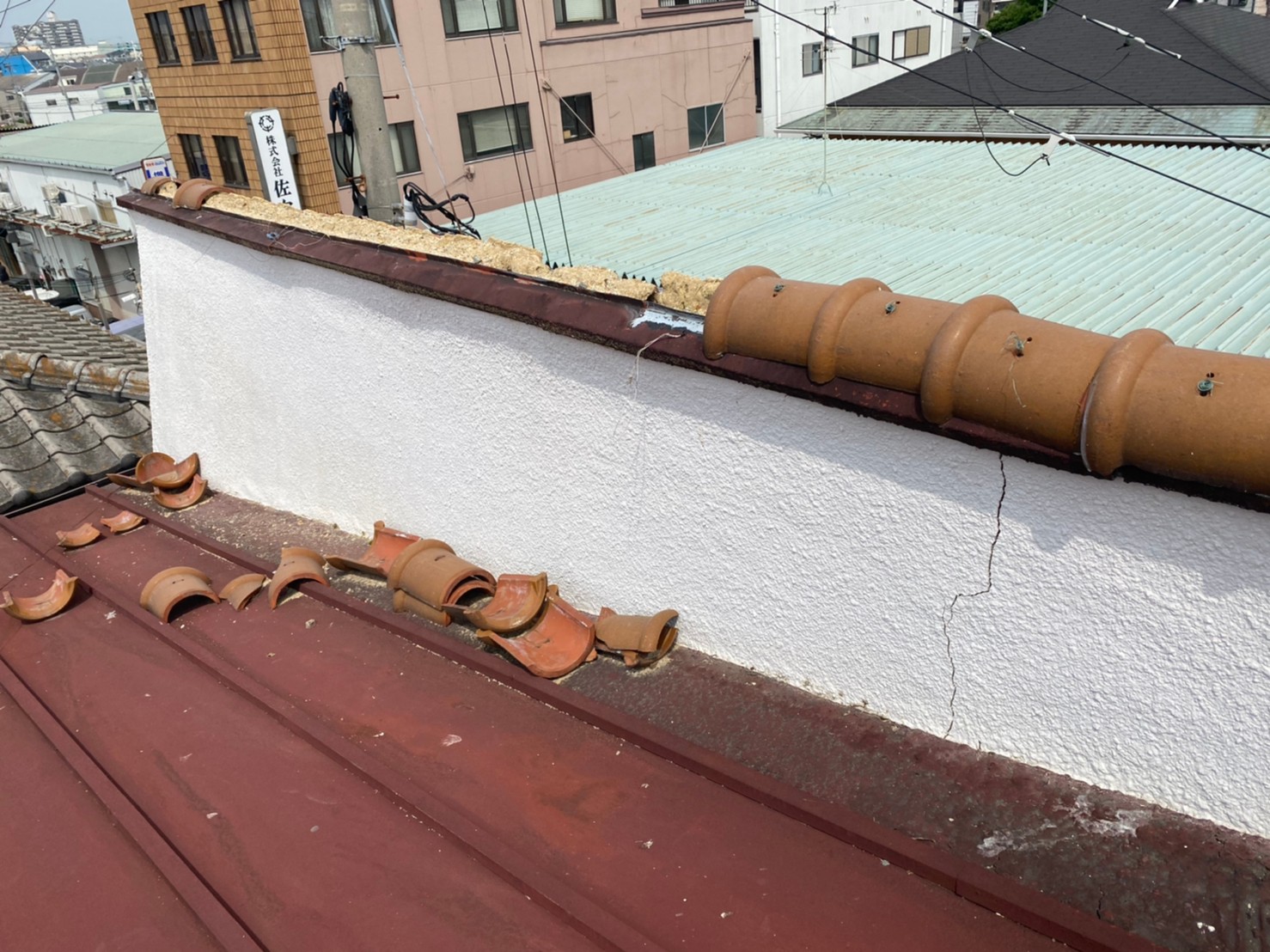 すでに雨漏れしていて、瓦をとめている下地も腐っており、外壁もひび割れし